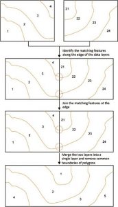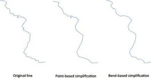 سپس چندین ویژگی هندسی هر خم را مانند اندازه، شکل و رابطه با خمهای همسایه آن اندازه گیری میکند، این ویژگیها تعیین میکنند که آیا یک خم حفظ شود یا برداشته شود. حذف خم با جایگزینی منحنی خم با خط پایه آن، خطی که نقاط انتهایی خم را به هم متصل میکند، انجام میشود. تکرار برای تعمیم تا زمانی انجام میشود که طول خط پایه هر خم روی خط بزرگتر از طول خط پایه خم مرجع باشد، که یک آستانه ساده سازی است که توسط کاربر مشخص شده است. رویکرد مبتنی بر خم معمولاً نقاط کمتری را حذف میکند، اما حفظ میکند. هندسه ای که به شکل اصلی (شکل اصلی و توپولوژی خط اصلی) نزدیکتر از رویکرد مبتنی بر نقطه است، همانطور که در شکل 3-15 نشان داده شده است. هر دو روش را میتوان در ArcGIS (کادر 3-10) پیاده سازی کرد.