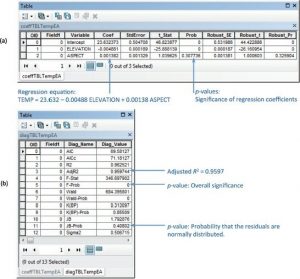 که در آن y میانگین دمای تخمینی،  ارتفاع، و جنبه است. مقدار  در جدول خروجی تشخیصی در شکل 5-20 b نشان می‌دهد که 97/95 درصد از تغییرات دما را می‌توان با ارتفاع و جنبه توضیح داد. مقدار p اندازه گیری اهمیت کلی معادله رگرسیون ذکر شده در جدول خروجی تشخیصی صفر است، نشان می‌دهد که معادله رگرسیون اهمیت کلی بسیار خوبی دارد و برای پیش بینی یا برآورد دما قابل اعتماد است. از گزارش pdf،   برای ارتفاع و برای جنبه هر دو 0516/1 است که کمتر از 5/7 است. بنابراین چند خطی کمی بین دو متغیر مستقل وجود دارد. مقدار p برای آزمون جارکیو-برآ  که در جدول خروجی تشخیصی ذکر شده است 408/0 بیشتر از α است که نشان می‌دهد باقی مانده‌ها به طور معمول توزیع شده اند. مقادیر p که اهمیت ضرایب رگرسیون فردی را اندازه‌گیری می‌کنند، تحت عنوان Prob در جدول خروجی ضریب فهرست شده‌اند. p-value برای elevation  صفر است، اما p-value برای جنبه 3077/0 است که بیشتر از α است. بنابراین، جنبه مهم نیست و باید حذف شود.