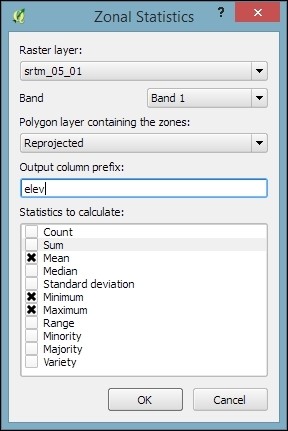 - اکنون میتوانیم با استفاده از ابزار Zonal Statistics، آمار مناطق تحلیلی را محاسبه کنیم که با رفتن به Raster | آمار منطقه ای در اینجا، میتوانیم پیشوند ستون خروجی مورد نظر را پیکربندی کنیم (در مثال ما انتخاب کردهایمelev، که مخفف ارتفاع است) و آمار برای محاسبه (به عنوان مثال،منظور داشتن،کمترین، وبیشترین، همانطور که در تصویر زیر نشان داده شده است: