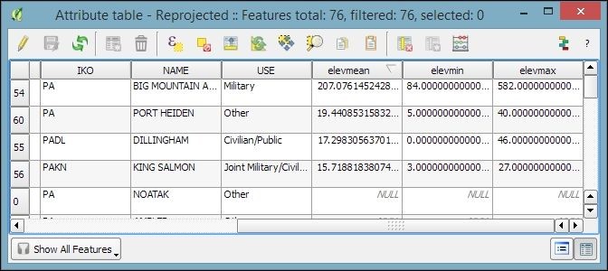 - پس از کلیک بر روی OK، همانطور که در تصویر زیر نشان داده شده است، آمار انتخاب شده به جدول ویژگی لایه چند ضلعی اضافه می شود. میتوانیم ببینیم که Big Mountain AFS فرودگاهی با بالاترین میانگین ارتفاع در بین چهار فرودگاهی است که در محدوده رستری ارتفاع ما قرار دارند: