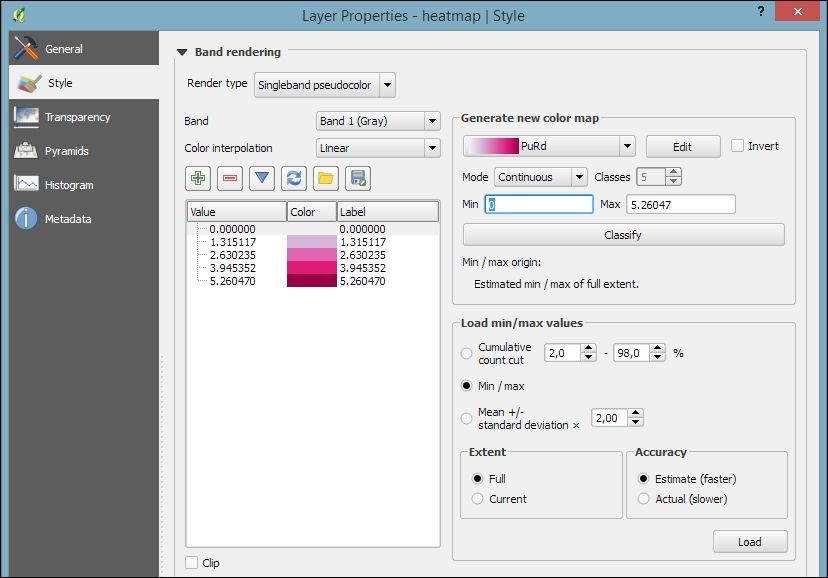 ممکن است مجبور شوید مقادیر را بسته به مجموعه داده ای که استفاده می کنید تنظیم کنید. بخش دسترسی به آمار لایه های رستری و برداری را در ادامه این فصل بررسی کنید تا نحوه یافتن حداقل و حداکثر مقادیر را در رستر خود بیاموزید.