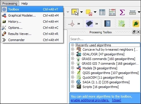 جامع ترین مجموعه ابزارهای تجزیه و تحلیل فضایی از طریق افزونه Processing قابل دسترسی است که می توانیم آن را در Plugin Manager فعال کنیم. هنگامی که این افزونه فعال می شود، یک منوی Processing پیدا می کنیم، جایی که می توانیم جعبه ابزار را فعال کنیم، همانطور که در تصویر زیر نشان داده شده است. در جعبه ابزار، به لطف کادر جستجوی پویا در بالا، به راحتی می توان ابزارهای تحلیل فضایی را با نام آنها پیدا کرد. این کار یافتن ابزارها را در جعبه ابزار آسان تر از منوی Vector یا Raster می کند. مزیت دیگر عادت کردن به ابزارهای پردازش این است که میتوان آنها را در پایتون و در مدلهای پردازش جغرافیایی خودکار کرد.