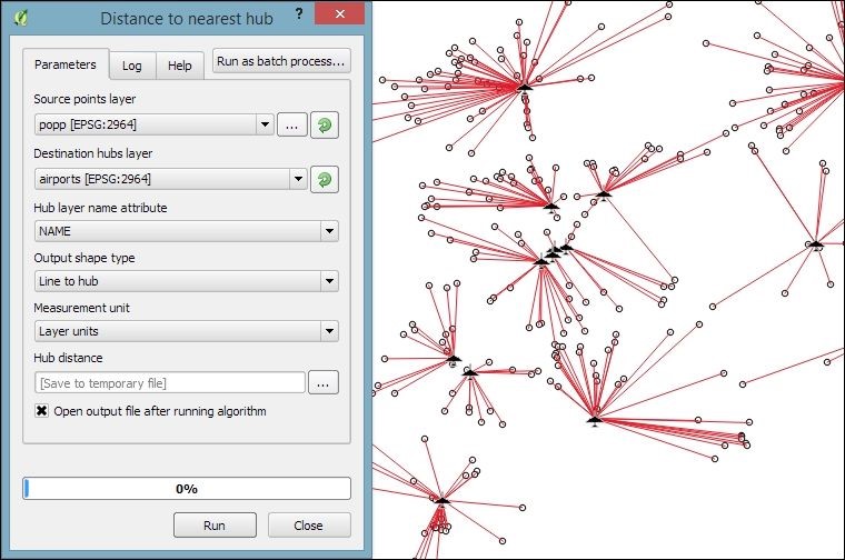 یافتن نزدیکترین همسایگان، به عنوان مثال، نزدیکترین فرودگاه به یک مکان پرجمعیت، یک کار رایج در ژئوپردازش است. برای یافتن نزدیکترین همسایه و ایجاد ارتباط بین ویژگیهای ورودی و نزدیکترین همسایه آنها در یک لایه دیگر، میتوانیم از ابزار Distance to nearest hub استفاده کنیم.