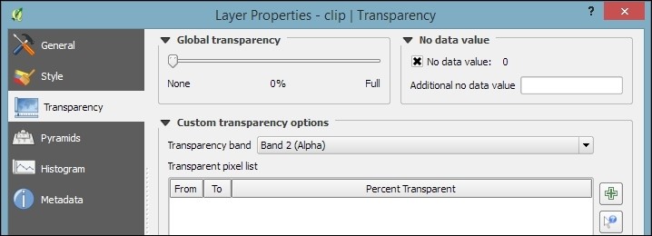 لایه بهدستآمده بهطور خودکار بارگذاری میشود، زیرا ما گزینه Load into canvas را هنگامی که تمام شد فعال کردهایم. QGIS همچنین باید لایه آلفای ایجاد شده را به طور خودکار تشخیص دهد و مناطق رستری که خارج از خشکی آلاسکا قرار دارند باید شفاف باشند، همانطور که در سمت راست در تصویر قبلی نشان داده شده است. اگر به دلایلی، QGIS به طور خودکار لایه آلفا را تشخیص ندهد، میتوانیم آن را به صورت دستی با استفاده از گزینه Transparency band در قسمت Transparency از ویژگیهای لایه رستری فعال کنیم، همانطور که در تصویر زیر نشان داده شده است. این گفتگو همچنین مکان مناسبی برای تعیین هر مقدار داده ای است که ممکن است بخواهیم استفاده شود: