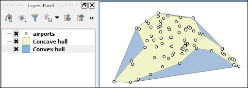 - بدنه مقعر: این ابزار یک بدنه مقعر در اطراف نقاط ورودی ایجاد می کند. بدنه مقعر چند ضلعی است که مساحت اشغال شده توسط نقاط ورودی را نشان می دهد. بدنه مقعر برابر یا کوچکتر از بدنه محدب است. در این ابزار می توانیم سطح جزئیات بدنه مقعر را با تغییر پارامتر Threshold بین0(بسیار مفصل) و1(که معادل بدنه محدب است). تصویر زیر مقایسه ای بین بدنه های محدب و مقعر را نشان می دهد (با آستانه تنظیم شده بر روی3) در اطراف داده های فرودگاه ما: