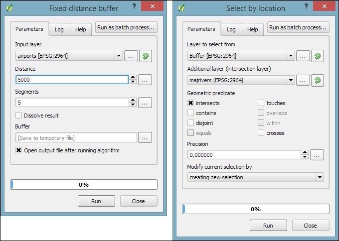 یکی از وظایف رایج تجزیه و تحلیل فضایی، شناسایی ویژگی ها در مجاورت ویژگی های خاص دیگر است. یک مثال می تواند یافتن همه فرودگاه ها در نزدیکی رودخانه ها باشد. استفاده كردنAirports.shpوmajrivers.shpاز داده های نمونه خود، می توانیم پیدا کنیمفرودگاه هادر داخل5000فوت یک رودخانه با استفاده از ترکیبی از بافر فاصله ثابت و ابزار انتخاب بر اساس مکان. از کادر جستجو برای یافتن ابزارها در جعبه ابزار پردازش استفاده کنید. تنظیمات ابزار برای این مثال در تصویر زیر نشان داده شده است: