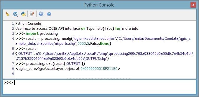 دستورات فهرست شده در زیر ALGORITHM همچنین می توانند برای فراخوانی ابزارهای پردازش از کنسول QGIS Python استفاده شوند که با رفتن به Plugins فعال می شوند | کنسول پایتون دستورات پایتون که در تصویر زیر نشان داده شده اند، الگوریتم بافر را اجرا می کنند (پردازش.runalg) و نتیجه را در نقشه بارگذاری کنید (پردازش. بار):