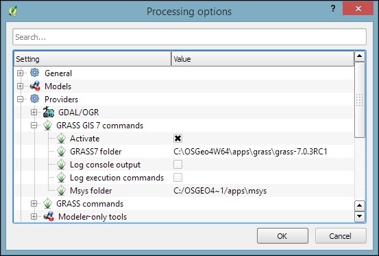 در زمان نگارش این کتاب، GRASS 7.0.3RC1 در OSGeo4W موجود است. همانطور که در تصویر قبلی نشان داده شده است، از نسخه قبلی GRASS 6.x نیز پشتیبانی میشود، و Processing را میتوان برای استفاده از الگوریتمهای آن پیکربندی کرد. در جعبه ابزار، الگوریتم های زیر دستورات GRASS GIS 7 و دستورات GRASS (برای GRASS 6.x) را خواهید یافت.