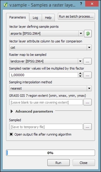 برای این تمرین، بیایید تصور کنیم که میخواهیم از لایه پوشش زمین در مکانهای فرودگاه دادههای نمونه خود نمونه برداری کنیم. تنها کاری که باید انجام دهیم این است که لایه برداری حاوی نقاط نمونه و لایه رستری که باید نمونه برداری شود را مشخص کنیم. برای این مثال، میتوانیم تمام تنظیمات دیگر را در مقادیر پیشفرض خود بگذاریم، همانطور که در تصویر زیر نشان داده شده است. این ابزار نه تنها از رستری نمونه برداری می کند، بلکه ویژگی های نقطه ای را با مقدار رستری نمونه گیری شده نیز مقایسه می کند. با این حال، ما در مثال فعلی خود به این مقایسه نیازی نداریم: