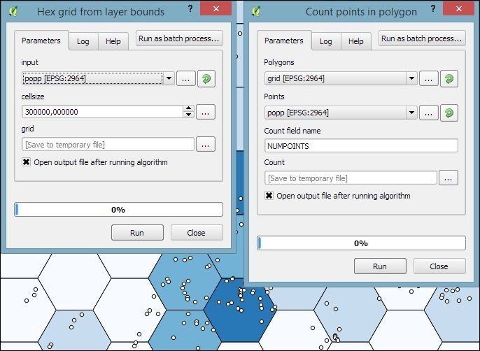 سپس، می توانیم از این اسکریپت برای ایجاد یک شبکه شش ضلعی استفاده کنیم که تمام نقاط لایه ورودی را پوشش می دهد. مجموعه داده مکان های پرجمعیت (popp.shp) یک مجموعه داده نمونه خوب برای این تمرین است. هنگامی که گرید آماده شد، میتوانیم Count points را در چند ضلعی اجرا کنیم تا آمار را محاسبه کنیم. اگر از تنظیمات نشان داده شده در تصویر زیر استفاده کنید، تعداد نقاط در ستون NUMPOINTS ذخیره می شود: