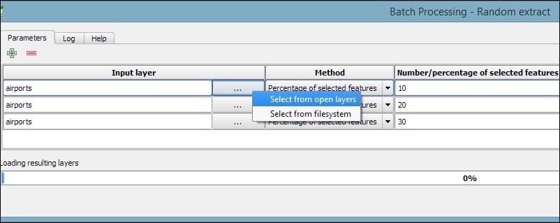 گاهی اوقات، میخواهیم همان ابزار را به طور مکرر اجرا کنیم اما با تنظیمات کمی متفاوت. برای این مورد، Processing عملکرد Batch Processing را ارائه می دهد. بیایید از این ابزار برای استخراج چند نمونه از لایه فرودگاه های خود با استفاده از ابزار استخراج تصادفی استفاده کنیم: