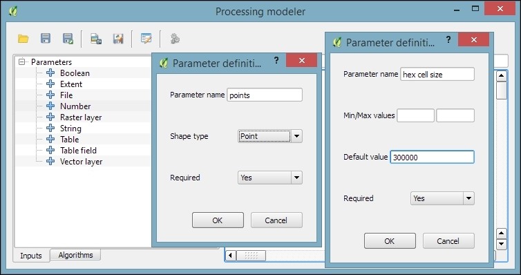 - با دوبار کلیک بر روی ورودی لایه Vector در لیست ورودی ها، می توانیم یک فیلد ورودی برای لایه نقطه اضافه کنیم. استفاده از نام پارامترهای توصیفی ایده خوبی است (به عنوان مثال،اندازه سلول هگزابه جای فقطاندازهبرای پارامتری که اندازه سلولهای شبکه شش ضلعی را کنترل میکند) تا بتوانیم تشخیص دهیم کدام ورودی اول و کدام بعد در مدل است. همچنین محدود کردن قسمت Shape type در هر کجا که مناسب باشد مفید است. در مثال ما، ورودی را به لایه های Point محدود می کنیم. این کار Processing را قادر میسازد تا لایههای موجود را از قبل فیلتر کند و فقط لایههای نوع صحیح را به ما ارائه دهد.