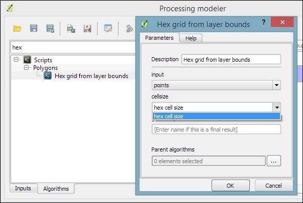 - در مثال ما، میخواهیم از لایه بردار نقطه به عنوان لایه ورودی و از اندازه سلول هگزا ورودی عدد به عنوان پارامتر سلولی استفاده کنیم. همانطور که در تصویر زیر نشان داده شده است، می توانیم از طریق لیست کشویی به ورودی های موجود دسترسی داشته باشیم. همچنین، میتوان با تایپ مقدار دلخواه در فیلد ورودی، پارامترهایی مانند اندازه سلول را کدگذاری کرد: