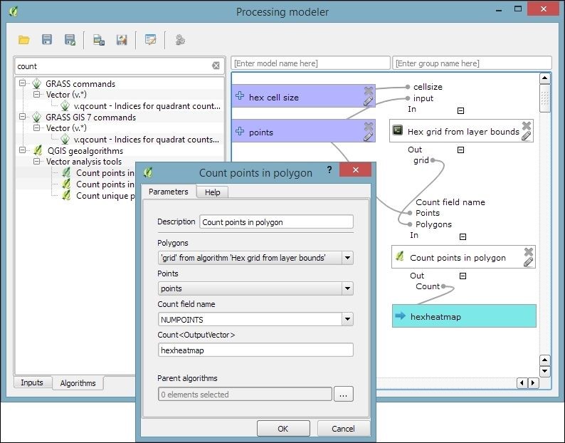 - برای تکمیل مدل، باید نام مدل را وارد کنیم (به عنوان مثال،نقشه حرارتی شش ضلعی ایجاد کنید) و نام گروه (به عنوان مثال،یادگیری QGIS). پردازش از نام گروه برای سازماندهی تمام مدل هایی که ایجاد می کنیم در گروه های جعبه ابزار مختلف استفاده می کند. وقتی نام و گروهی را انتخاب کردیم، میتوانیم مدل را ذخیره کرده و سپس آن را اجرا کنیم.