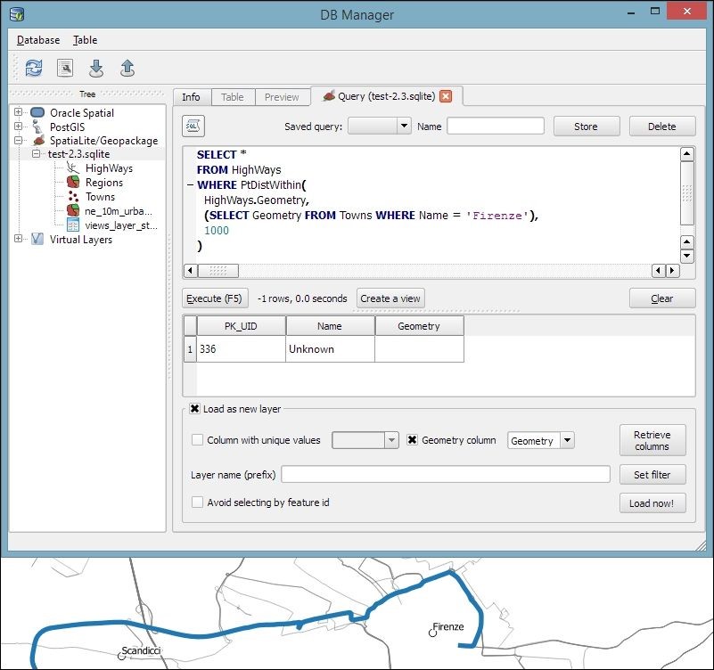 - در مرحله بعد، میتوانیم با استفاده از دکمه نوار ابزار پنجره SQL، با رفتن به پایگاه داده | یک تب Query باز کنیم پنجره SQL یا با فشار دادن F2. پرس و جوی SQL زیر تمام بزرگراه هایی را که در فاصله 1 کیلومتری شهر Firenze هستند انتخاب می کند: