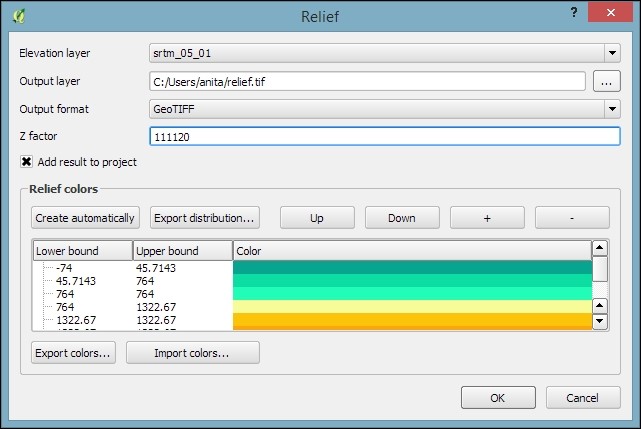 از آنجایی که رسترهای SRTM در WGS84 EPSG:4326 ارائه شده اند، باید از ضریب Z استفاده کنیم.111120در تمرین ما بیایید یک تسکین ایجاد کنیم! این ابزار می تواند به طور خودکار محدوده های رنگی را محاسبه کند. همانطور که در تصویر زیر نشان داده شده است فقط باید روی Create automatically کلیک کنیم. البته، همچنان میتوانیم کرانهای بالا و پایین محدوده ارتفاع و همچنین رنگها را با دوبار کلیک کردن روی ورودی فهرست مربوطه ویرایش کنیم: