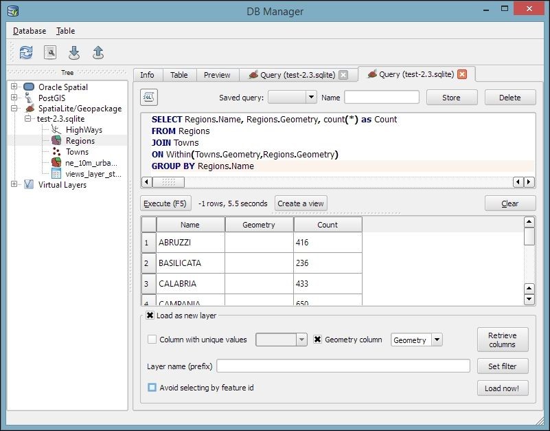 اگر قسمت Loading data from databases را دنبال کرده باشیدفصل 2، با مشاهده داده های مکانی، خواهید دیدtest-2.3.sqliteهمانطور که در تصویر بعدی نشان داده شده است، در زیر SpatiaLite در درخت سمت چپ کادر گفتگوی مدیریت DB فهرست شده است. اگر پایگاه داده در لیست نیست، برای تنظیم اتصال پایگاه داده به بخش ذکر شده قبلی مراجعه کنید.