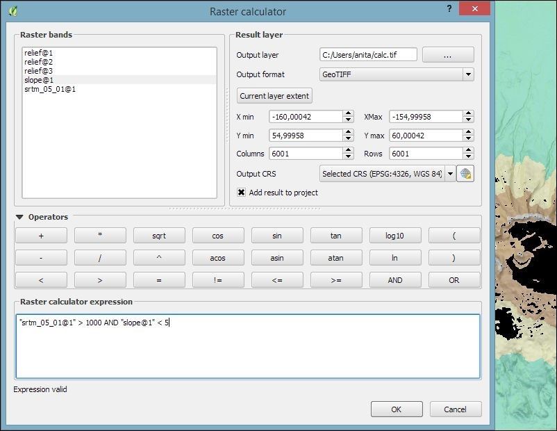 ” srtm_05_01@1 ” > 1000 AND ” slope@1 ” < 5