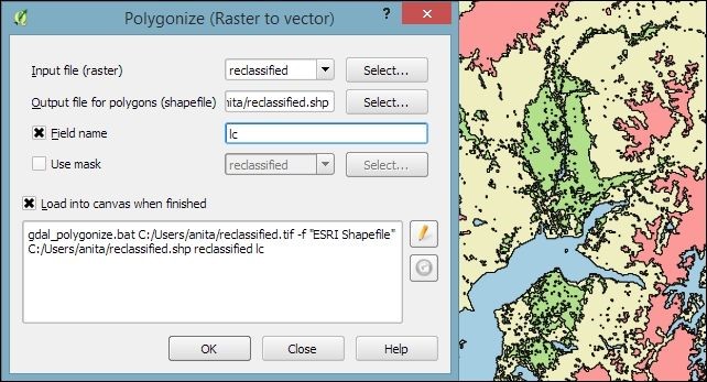 چندضلعی کردن یک رستر را به یک لایه چند ضلعی تبدیل می کند. بسته به اندازه رستری ، تبدیل ممکن است کمی طول بکشد. هنگامی که فرآیند به پایان رسید، QGIS با یک پنجره به ما اطلاع می دهد. برای یک آزمایش سریع، میتوانیم، برای مثال، طبقهبندی مجدد را تبدیل کنیمپوشش زمینرستری به چند ضلعی لایه چند ضلعی برداری حاصل شامل چندین ویژگی چند ضلعی با یک ویژگی واحد است که نام آن را می گذاریمال سی; همانطور که در تصویر زیر نشان داده شده است، به مقدار رستری اصلی بستگی دارد:
