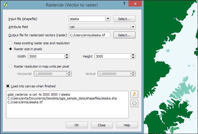 استفاده از ابزار Rasterize بسیار شبیه به استفاده از ابزار Polygonize است. تنها تفاوت این است که میتوانیم اندازه رستری حاصل را در پیکسل/سلول مشخص کنیم. همانطور که در تصویر بعدی نشان داده شده است، میتوانیم فیلد ویژگی را نیز مشخص کنیم، که ورودی مقدار سلول رستری را ارائه میدهد. در این مورد، ویژگی گربه ماalaska.shpمجموعه داده تقریباً بی معنی است، اما شما این ایده را در مورد نحوه عملکرد ابزار دریافت می کنید: