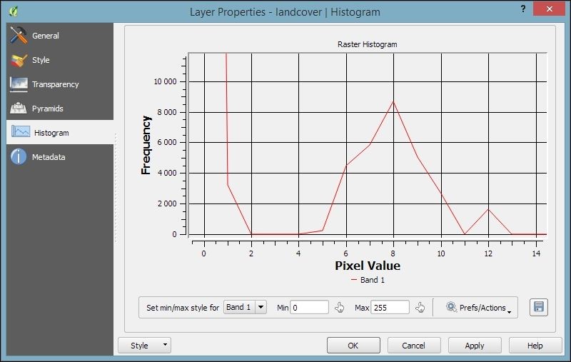 - هیستوگرام: این تب توزیع مقادیر رستری را نشان می دهد. از ماوس برای بزرگنمایی هیستوگرام برای مشاهده جزئیات استفاده کنید. به عنوان مثال، تصویر زیر نسخه بزرگنمایی شده هیستوگرام را برای ما نشان می دهدپوشش زمینمجموعه داده: