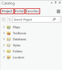 وقتی یک پروژه جدید ساخته می­ شود و یا یک پروژه از قبل ساخته شده توسط کاربر باز می­شود، معمولا اولین کادری که در سمت راست پنجره نمایش و در مقابل کادر Contents دیده می ­شود، کادر Ctalog است. این کادر از سه سربرگ Project، Portal و Favorite تشکیل شده است و عملکرد آن تا حدودی مشابه با کادر Catalog در نرم ­افزار ArcMap است.