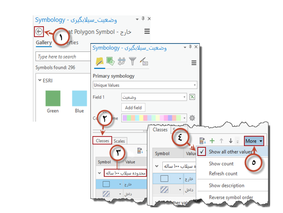 10) بر روي فهرست بازشونده More کلیک کرده و تیک گزینه Show All Other Value را بردارید. در کادر Contents، به تغییر نمادهای لایه «وضعیت سیلاب گیری» دقت کنید.