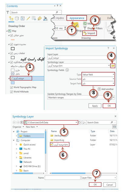 12) در این کادر، در سمت راست فهرست بازشونده Symbology Layer، بر روي دکمه Browse کلیک کرده و از فهرست موجود، لایه «حوضه آبریز. Lyrx» را انتخاب کنید (این فایل در مسیر C: \Exercises\Ex6\Data در دسترس است و به­ صورت پیش­فرض یک اتصال به آن برقرار شده است). بر روي دکمه Ok کلیک کنید.