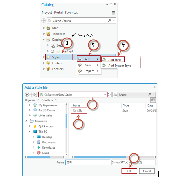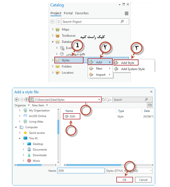 3) در کادر Catalog، بر روی گروه Styles کلیک راست کرده و گزینه Add و سپس Add Style را انتخاب کنید تا پنجره Add a Style File باز شود. در سمت چپ این پنجره، بر روي گروه Folders کلیک کرده و در سمت راست، از پوشه Data، گزینه ESRI را انتخاب کنید. بر روي دکمه Ok کلیک کنید.