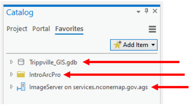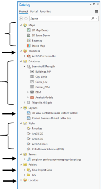 هر آیتمی (مولفه، منبع ذخیره و…) که در یک پروژه ذخیره می­ شود را آیتم پروژه گویند (برای نمونه نقشه ­ها، چشم­ اندازها، اتصال به پوشه ­ها، اتصال به پایگاه­ های داده، اتصال به سرور ArcGIS، اتصال به سرویس نقشه وب (WMS)، جعبه­ های ابزار، مکانیاب­ ها و…) از طریق کادر کاتالوگ یا نمای کاتالوگ می­توان به آیتم­های پروژه دسترسی داشت.