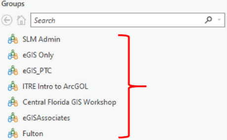 4) بر روي سربرگ Groups کلیک کنید تا گروه ­های در دسترس فهرست شوند. اگر در فهرست مربوطه هیچ موردی وجود نداشت بدان معناست که تاکنون در ArcGIS Online و یا Portal for ArcGIS هیچ گروهی تعریف نکرده ­اید.