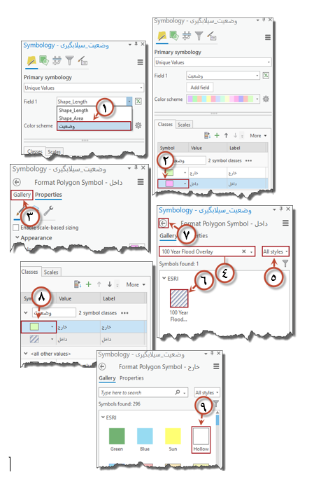 8) در پایین کادر Symbology، بر روي نماد «داخل» و سپس بر روی دکمه Gallery کلیک کنید. در جعبه جستجو، عبارت Flood را تایپ کرده و فهرست بازشونده مقابل جعبه جستجو را بر روی گزینه All Styles تنظیم کنید. دکمه Enter صفحه کلید را فشار داده و در فهرست موجود، نماد 100 Year Flood Overlay را انتخاب کنید (این نماد در سبک ESRI که در مرحله قبل به نرم­ افزار معرفی کردید موجود می­ باشد). در بالای کادر Symbology، بر روي دکمه Return to primary Symbology pane  کلیک کنید.