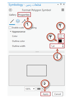 5) در کادر Contents، بر روی نماد لایه «قطعات زمین» کلیک کنید تا کادر Symbology در سمت راست پنجره نمایش باز شود. در کادر Symbology، بر روي دکمه Properties کلیک کرده و از فهرست بازشونده Color گزینه No Color را انتخاب کنید. از فهرست بازشونده Outline Color نیز گزینه Black را با ضخامت 1pt انتخاب کنید. بر روي دکمه Apply کلیک کنید.