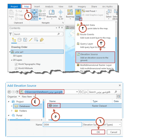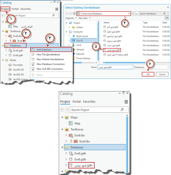 1) در کادر Catalog، بر روي سربرگ Project کلیک کنید. سپس بر روي گروه Database کلیک راست کرده و گزینه Add Database را انتخاب کنید تا پنجره Select Existing Geodatabase باز شود. در این پنجره، مسیر C: \Exercises\Databases را دنبال کرده و ژئودیتابیس «شهر یونین» را به نرم­افزار معرفی کنید. بدین ترتیب در کادر Catalog، ژئودیتابیس مذکور به گروه Database اضافه می­ شود.