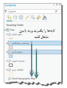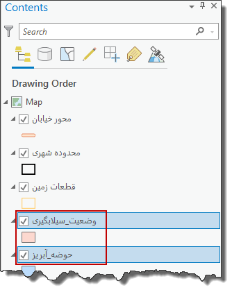 1) در کادر  Contents، لایه «حوضه آبریز» را گرفته و به پایین لایه «قطعات زمین» بکشید. به­ همین ترتیب لایه «وضعیت سیلاب گیری» را نیز بگیرید و در زیر لایه «قطعات زمین» قرار دهید.