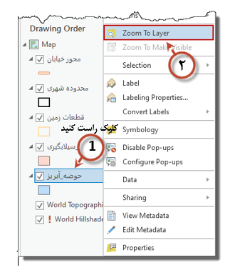 2) در کادر Contents، بر روي لایه «حوضه آبریز» کلیک راست کرده و گزینه Zoom to Layer را انتخاب کنید.