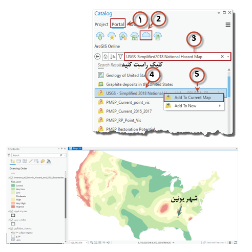 1) در کادر Catalog، بر روي سربرگ Portal کلیک کنید. سپس بر روي دکمه All Prtal کلیک کرده و در جعبه جستجو، عبارت USGS-Simplified2018 National Hazard Map را تایپ کنید. دکمه Enter صفحه کلید را فشار دهید تا موارد مربوطه در کادر جستجو فهرست شوند.