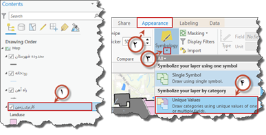 10) در کادر Contents بر روی نام لایه «کاربری زمین» کلیک کنید تا این لایه فعال شود. در بالای روبان، بر روی سربرگ Appearance و در روبان، در گروه Drawing، بر روی مثلث کوچکی که در زیر دکمه Symbology قرار دارد کلیک کنید و گزینه Unique Values را انتخاب کنید تا کادر Symbology با تنظیمات مربوط به نمادگذاری Unique Value باز شود.