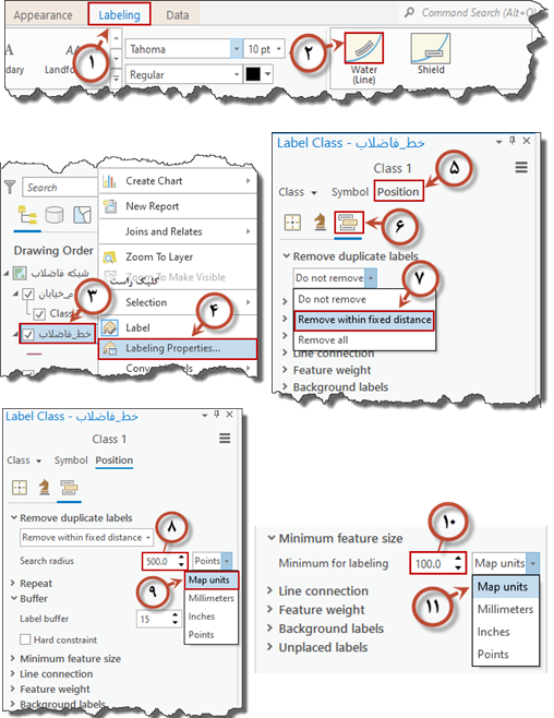 13) پروژه را ذخیره کنید. 10- تنظیم محل قرارگیری برچسب ها: 1) مطمئن شوید در بالای روبان، سربرگ Labeling فعال است. در روبان، در گروه Label Placement، گزینهWater (Line) را انتخاب کنید. در کادر Contents، بر روي لایه «خط_فاضلاب» کلیک راست کرده و گزینه Labeling Properties را انتخاب کنید تا کادر Label Class در سمت راست پنجره نمایش باز شود (درصورت باز شدن پنجره Save Expression، بر روي دکمه Ok کلیک کنید). 2) در کادر Label Class، بر روي سربرگ Position و سپس بر روي دکمه Conflict Resolution کلیک کنید. 3) از فهرست موجود، فهرست Remove Duplicate Label را باز کرده و گزینه Remove within a fixed distance را انتخاب کنید. 4) در جعبه Search Radios، عدد 500 و در جعبه روبه روی آن گزینه Map Units را انتخاب کنید. با انجام این کار حداقل فاصله بین دو برچسب در نقشه برابر با 500 متر خواهد شد. این کار مانع تداخل برچسب ها میشود. 5) فهرست Minimum feature size را باز کرده و در جعبه Minimum for labeling عدد 100 و در جعبه روبه روی آن گزینه Map Units را انتخاب کنید. با انجام این کار حداقل اندازه برچسب ها 100 متر خواهد شد.