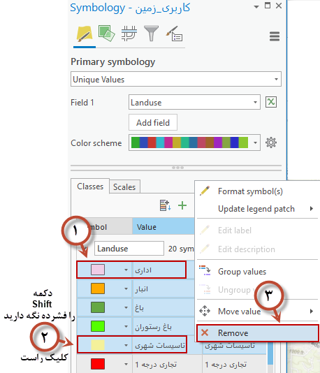 11) در کادر Symbology، ردیف مربوط به کاربری «اداری» را انتخاب کرده و با فشرده نگه داشتن دکمه Shift صفحه کلید، بر روي کاربری «تاسیسات شهری» کلیک کنید تا تمامی کاربری هایی که بین این دو کاربری قرار گرفته اند، انتخاب شوند. بر روي کاربری «تاسیسات شهری» کلیک راست کرده و گزینه Remove را انتخاب کنید تا تمامی کاربری های انتخابی از فهرست نمادگذاری حذف شوند. همین کار را برای سایر کاربری ها به جز «تجاری درجه 1»، «تجاری درجه 2» و «تجاری درجه 3» انجام دهید تا فقط کاربریهای تجاری بر روي نقشه نشان داده شود (دقت کنید ردیف مربوط به All Other Values را هم Remove کنید).