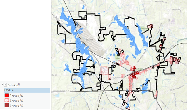 8) پروژه را Save کنید. 9) قرار است در این تمرین نقشه موقعیت کاربری های تجاری که مساحت 500 تا 2500 مترمربع دارند را تهیه کنید. در مسیر C:\Exercises\Data یک فایل با فرمت Lyr و با عنوان «کاربری زمین» وجود دارد که کاربری زمین در شهر تریپول را نشان می دهد. در این فایل تنظیمات نمادگذاری نیز ذخیره شده است (کاربریهای تجاری با کدهای «تجاری درجه 1»، «تجاری درجه 2» و «تجاری درجه 3» تعریف و رنگبندی شده اند). کادر Catalog را باز کرده و گروه Folders و سپس Data را باز کنید. بر روی لایه «کاربری زمین» کلیک راست کرده و گزینه Add to Current Map را انتخاب کنید تا این لایه به نقشه اضافه شود.