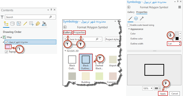 3) در کادر Contents، بر روي نماد لایه «محدوده شهر تریپول» کلیک کنید تا کادر Symbology در سمت راست پنجره نمایش باز شود. در این کادر بر روي گزینه Gallery کلیک کرده و از فهرست نمادها، نماد Black Outline (2pts) را انتخاب کنید (در صورت نیاز به جستجوی یک نماد، می توان نام آن نماد را تایپ کرده و جستجو نمود. در این حالت با انتخاب گزینه All Style به جای Project Style، نمادهای متعددی در اختیار کاربر قرار میگیرد که جستجو از میان آنها انجام می شود). 4) بر روی دکمه Properties کلیک کنید و از فهرست Appearance، گزینه Outline width را بر روی 3pt تنظیم کنید. در پایین کادر Symbology بر روی دکمه Apply کلیک کنید.