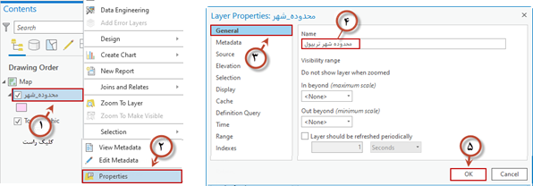 کشیدن و رها کردن لایه ها یکی از روش های فراخوانی آنها به نقشه میباشد. پس از فراخوانی لایهها به نقشه، مقیاس نقشه تغییر می کند و پنجره نمایش به گونه ای بزرگ نمایی می شود که تمامی عوارض لایه فراخوانی شده قابل مشاهده باشد. اولین لایه ای که به یک نقشه اضافه می شود، سیستم مختصات نقشه موردنظر و بزرگنمایی اولیه آن را تعیین میکند. لایههایی که سیستم مختصات متفاوت داشته و به نقشه اضافه میشوند، بهطور موقتی تغییر سیستم مختصات داده شده و با نقشه منطبق خواهند شد. 2) در کادر Contents، بر روي نام لایه «محدوده_ شهر» دوبار کلیک کنید تا پنجره Layer Properties باز شود. در این پنجره، گزینه General را انتخاب کرده و در جعبه Name، عبارت «محدوده شهر تریپول» را تایپ کنید. سپس بر روي دکمه Ok کلیک کنید (در نامگذاری لایهها و ذخیره آنها در پایگاه داده بهتر است بین دو کلمه از _ (آندرلاین) استفاده کنید. اما در تغییر نام لایه ها در کادر Contents محدودیت خاصی وجود ندارد چرا که با تغییر نام لایه ها در این کادر، نام اصلی آنها در محل ذخیره تغییر نخواهد کرد).