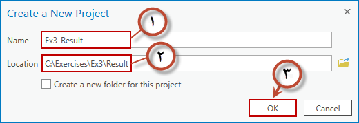 2) در این پنجره، در جعبه Name، عبارت Ex3-Result را تایپ کرده و در جعبه Location، مسیر C:\Exercises\Ex3\Result را دنبال کنید. تیک گزینه Create a new folder for this project را برداشته و بر روی دکمه Ok کلیک کنید تا پروژه جدیدی با عنوان Ex3-Result ایجاد شود (با فعال بودن تیک گزینه Create a new folder for this project، پوشه جدیدی در پوشه Result ساخته خواهد شد و پروژه مذکور در آن ذخیره می شود).
