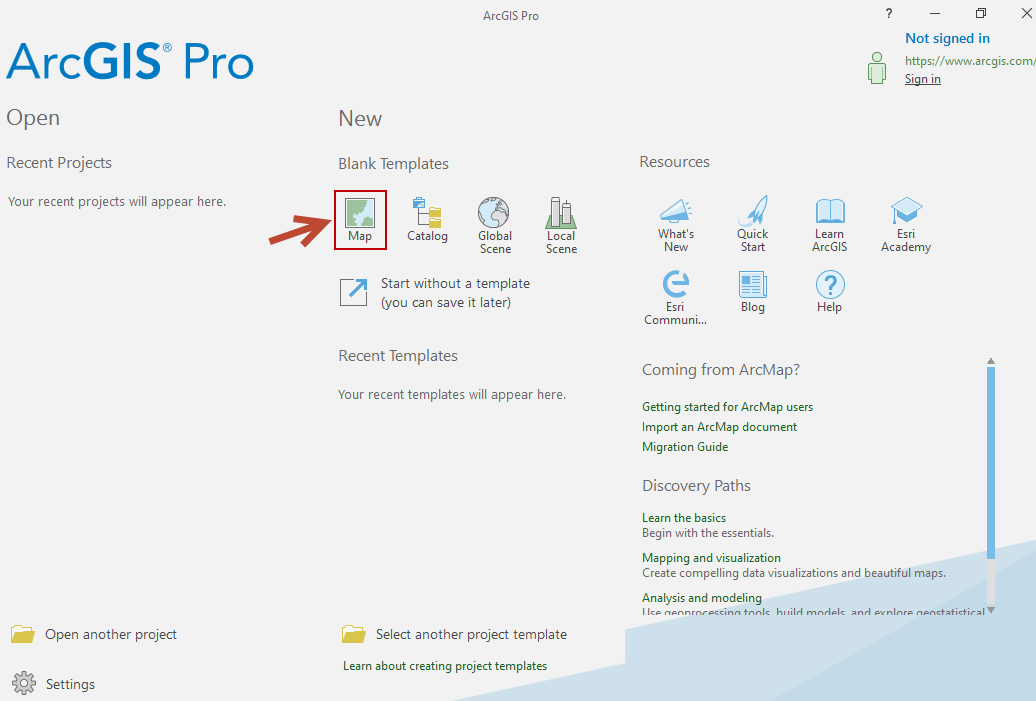 حل تمرين 1- ایجاد یک پروژه جدید: 1) برنامه ArcGIS Pro را باز کرده و پس از باز شدن این برنامه، در قسمت New و Blank Template، بر روي گزینه Map کلیک کنید تا پنجره Create New Project باز شود.