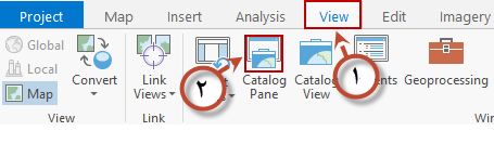 2- اتصال به منبع داده ها: 1) در بالای روبان، بر روی سربرگ View و در روبان، در گروه Windows، بر روی دکمه Catalog Pane کلیک کنید تا کادر Catalog در سمت راست پنجره نمایش باز شود.