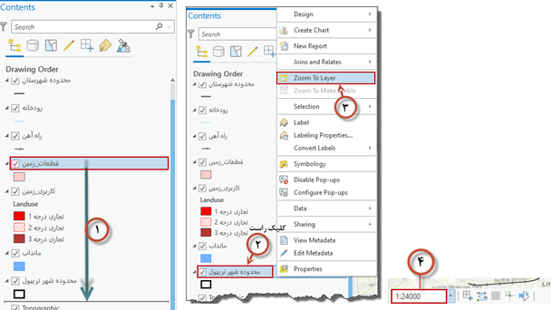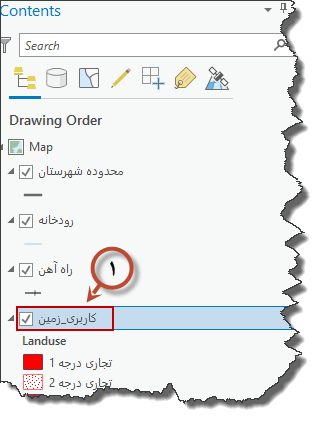 9- اضافه کردن لایه خط فاضلاب به نقشه و برچسبگذاری آن: 1) مطمئن شوید نقشه «کاربری تجاری مورد نظر» فعال است. در کادر Contents، نام لایه «کاربری زمین» را به «کاربری تجاری موردنظر» تغییر دهید.