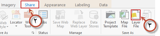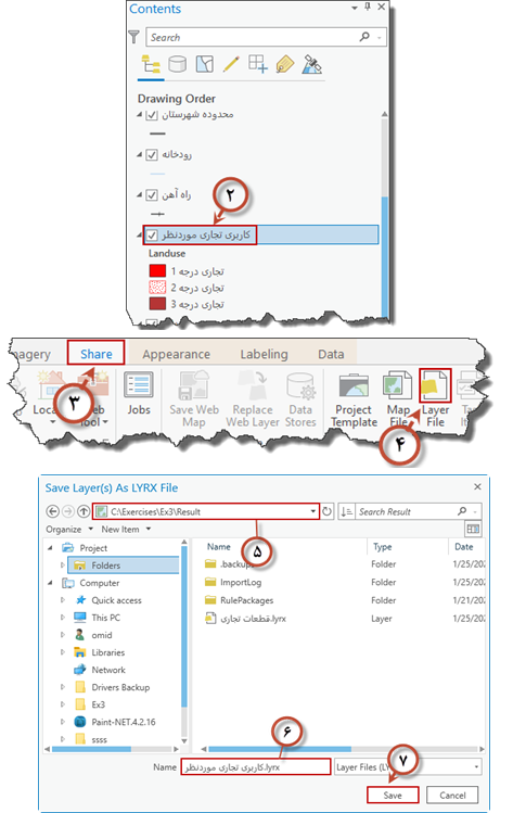 4- ذخیره لایه با فرمت Lyr: 1) در کادر Contents، بر روی نام لایه «کاربری زمین» کلیک کنید تا این لایه فعال شود. در بالای روبان، بر روی برگه Share و در روبان، در گروه Save As، بر روي دکمه Layer File کلیک کنید تا پنجره Save Layer(s) As LYRX File باز شود.