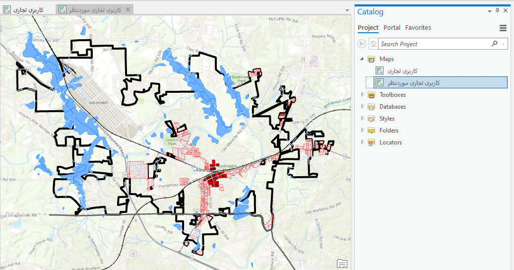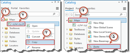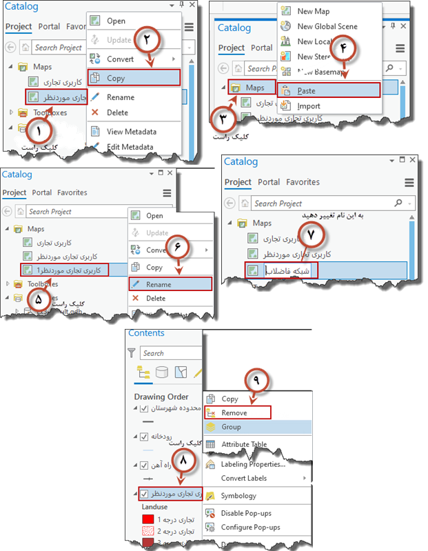 6- ایجاد نقشه جدید در پروژه: 1) در کادر Catalog، گروه Map را باز کرده و از فهرست موجود، بر روي نقشه «کاربری تجاری» کلیک راست کنید. سپس گزینه Copy را انتخاب کنید. دوباره بر روی گزینه Map کلیک کرده و گزینه Paste را انتخاب کنید. بدین ترتیب از نقشه «کاربری تجاری» دقیقا یک کپی و با عنوان «کاربری تجاری 1» در پروژه جاری ایجاد می شود. در کادر Catalog، بر روي نام نقشه «کاربری تجاری1» دوبار کلیک کنید تا نقشه جدیدی به پنجره نمایش اضافه شود. 2) به روش دلخواه، نام نقشه «کاربری تجاری 1» را به «کاربری تجاری مورد نظر» تغییردهید.