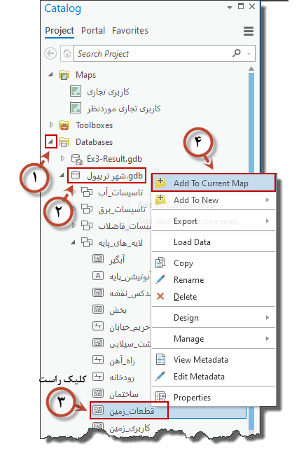 3) در کادر Catalog، گروه Databases را باز کرده و ژئودیتابیس «شهر تریپول» و سپس مجموعه عارضه «لایه_های_پایه» را باز کنید. بر روي کلاس عارضه «قطعات_زمین» کلیک راست کرده و گزینه Add to Current Map را انتخاب کنید تا این کلاس عارضه به نقشه اضافه شود.